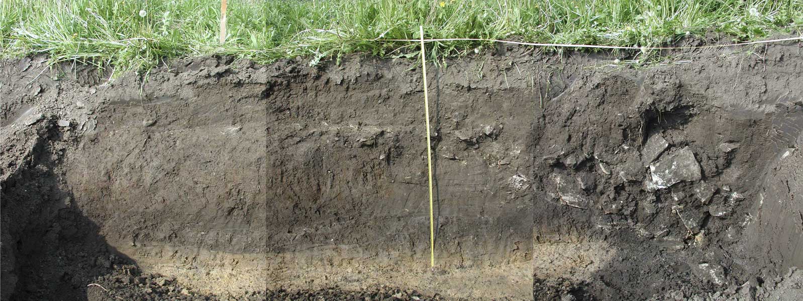 Bylo proto velmi pravděpodobné, že k porušení archeologických situací dojde i při plánované výstavbě. Výzkum probíhal v dolní části mírného svahu, který sestupuje z centrální části Malína do nivy potoka Beránka. Geologické podloží zkoumané plochy je zde tvořeno výhradně spraší, na kterou dosedá tmavě hnědá půda v mocnosti 30 až 40 cm. Směrem k severu se charakter půdy mění na nivní. (obr. 16)